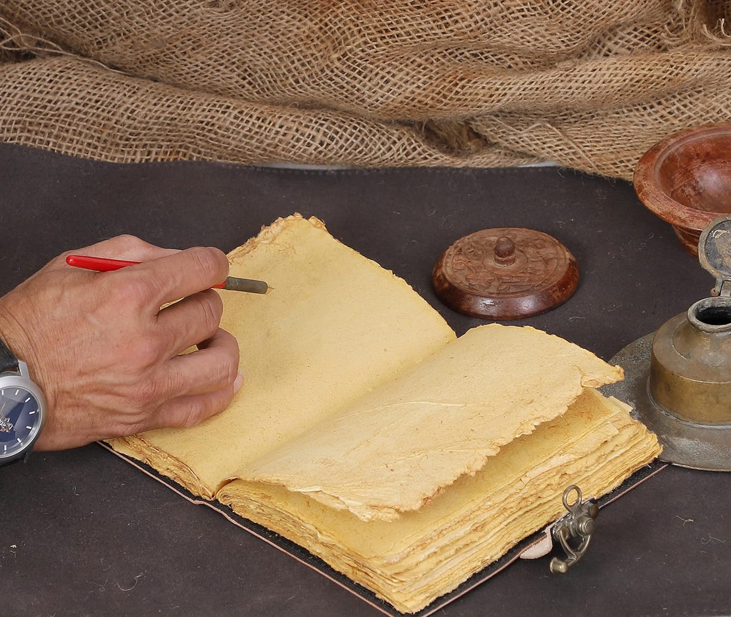 This 7x5 inch, 1.5 inch thick and 22x14 inch Large leather notebook includes 200 pages of recycled, unlined deckle edge paper—perfect for journaling, sketching, note-taking, poetry, scrapbooking, or travel writing.
