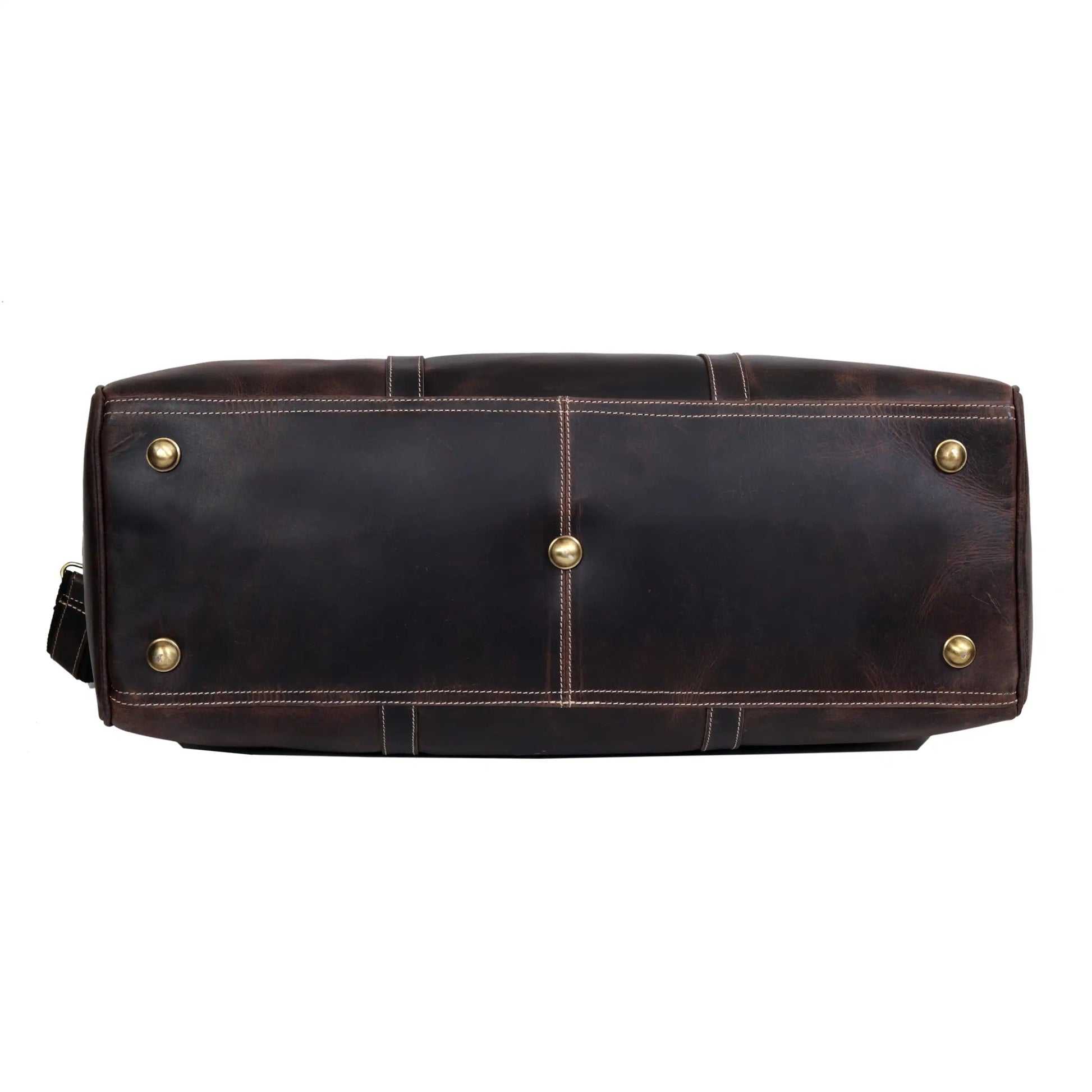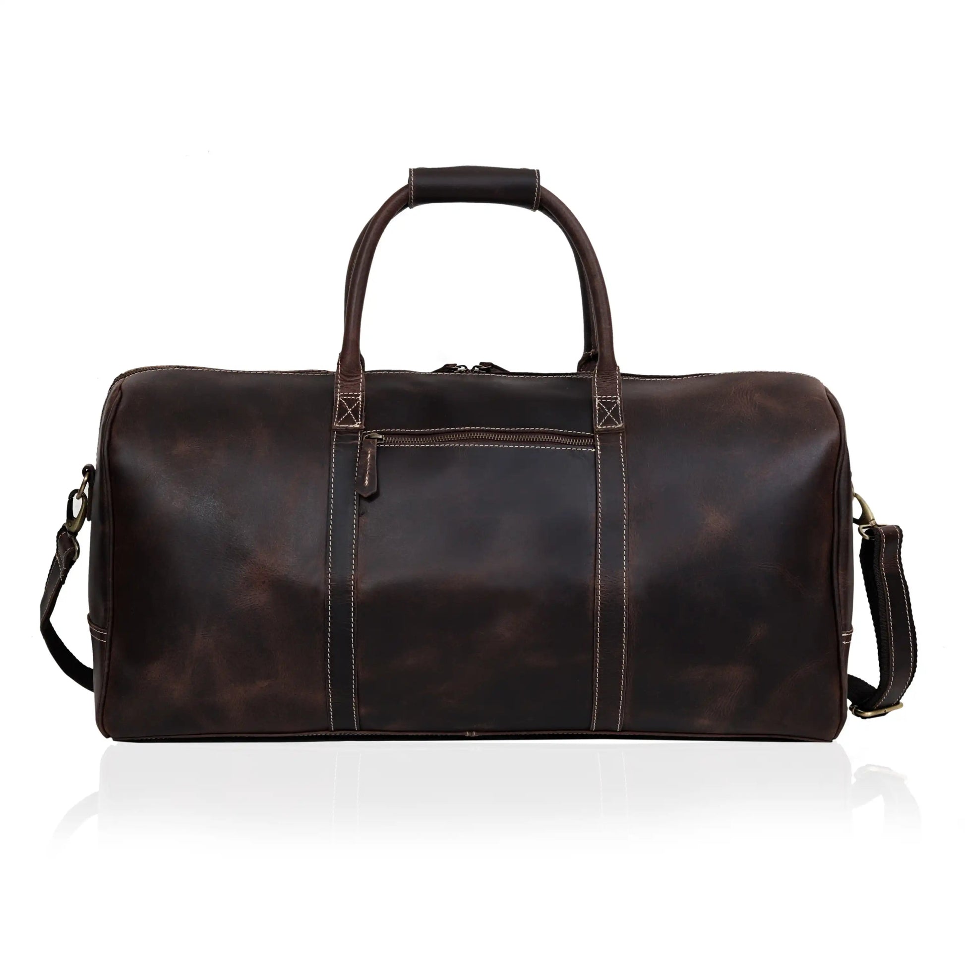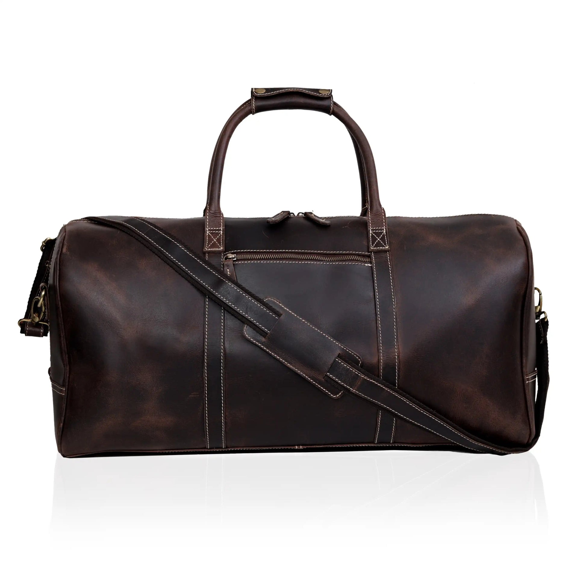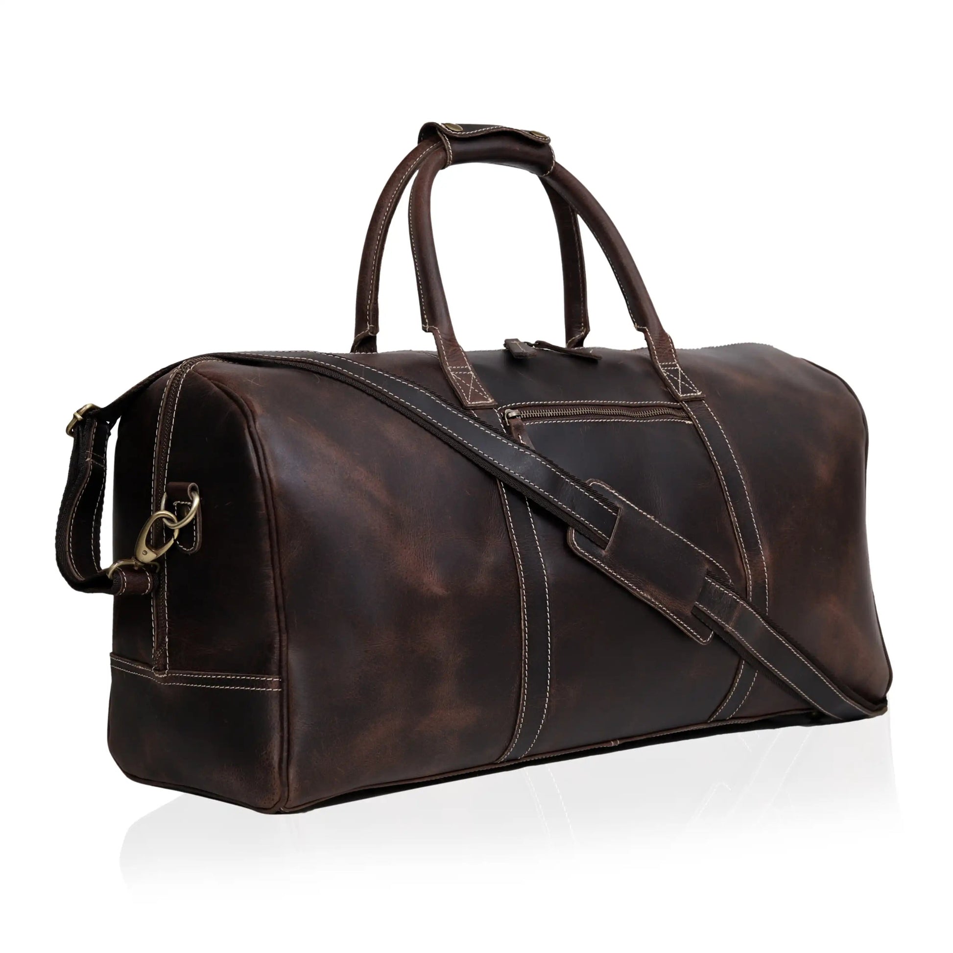 - Tough all-leather carry handle on one end and exterior pockets with buckles