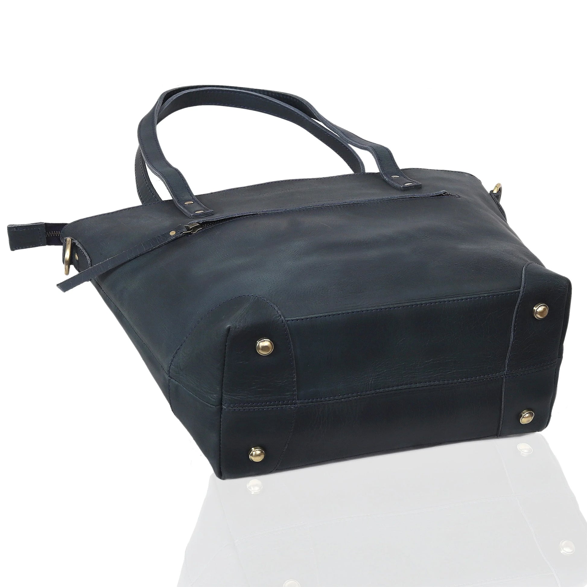 This women's buffalo leather tote bag has a distinctive natural aroma that mellows within days of use. The deep navy tones are achieved through traditional, ensuring each bag has unique color variations and grain patterns.