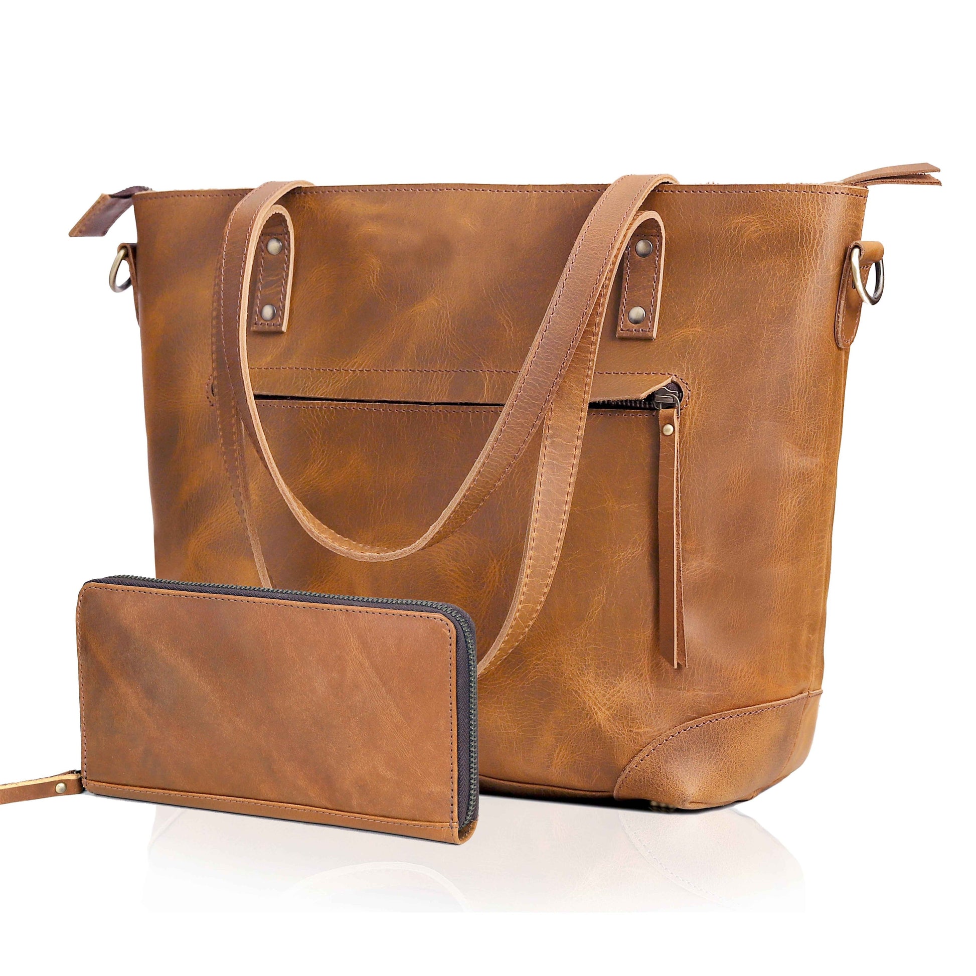 This women's buffalo leather tote bag has a distinctive natural aroma that mellows within days of use. The deep tan tones are achieved through traditional, ensuring each bag has unique color variations and grain patterns.